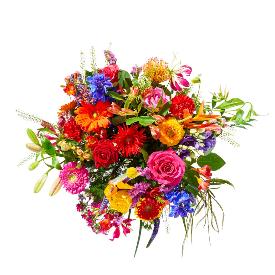 Je hebt van die boeketten die voor een betovering zorgen met haar sprankeling en kleurpracht. Dit kleurrijke boeket zorgt voor een ware kleurexplosie en een onvergetelijke indruk. Maak de verrassing compleet met een mooi cadeauartikel! (excl. vaas)